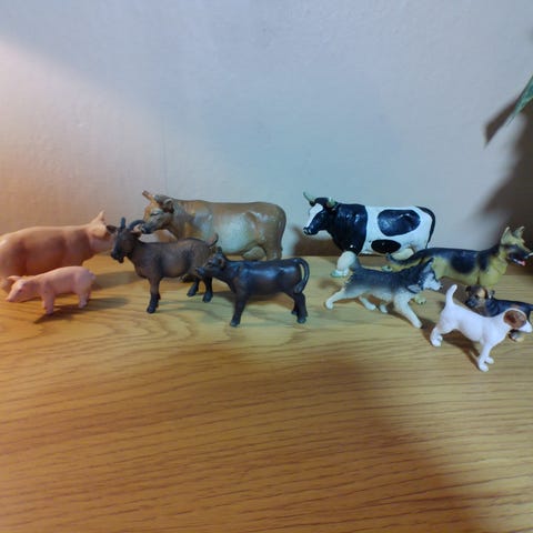 10 Figurer.. Alle er Schleich og i standen som ses på billedet. Figurerne sælges kun sammen i den pakke der er vist, Ingen løssalg. Sender med fast pris uanset vægt og antal af lots med DAO til 47kr.. Inkluderer: Tyr, Ged, Kat, Høne, Hvalp, Hund, Undulat, kanin, Gås