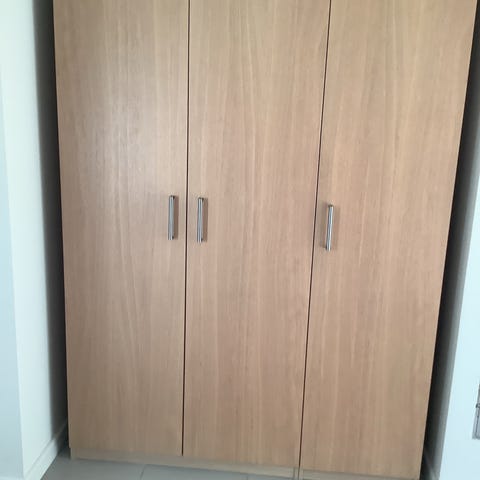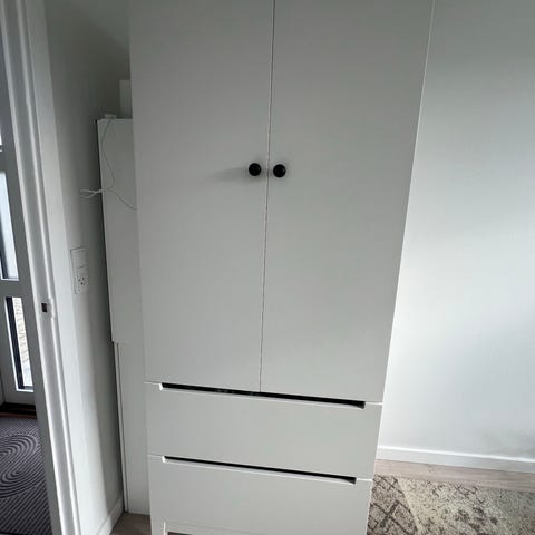 Jeg sælger dette garderobeskab for 400 kroner. Tror den er købt i Ikea, men det er mange år siden. Skabet er i rigtig god stand, men bagpå sidder pladen ikke helt fast. Den skal fikses nogle steder, men ellers fejler den ikke noget. Hylder og stang medfølger. Der er 4 hylder plus 1 i det store.