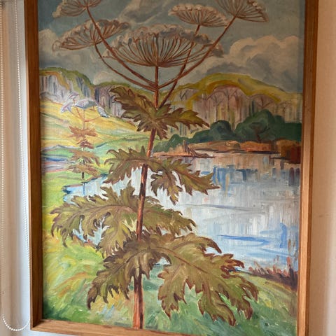 Maleri med motiv af en melon og blomster på en lys baggrund. Maleriet er olie på plade og er indrammet med en grøn ramme og har en kæde til ophæng på bagsiden.