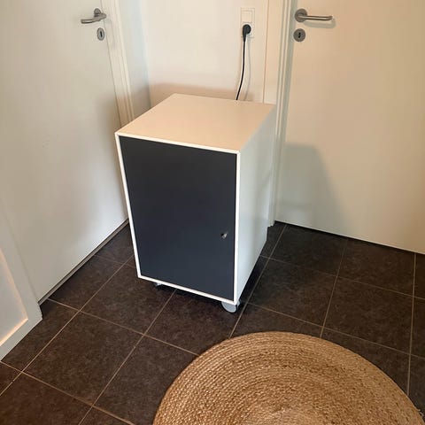 Et stk barskab og et overskab, barskabet har indbygget lys og glasplade inde i barskabet, som slås ned til et barbord når den er åben, Farven er koksgrå med rød låge på barskab og overreol er koksgrå med rød hylde. Model 4118, nypris er ca 14000 kr(skuffemodul følger ikke med) samlet pris. Giv gerne et realistisk bud