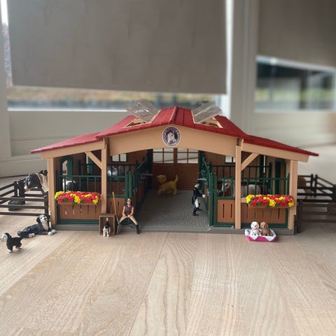 Schleich stald model nummer 42195 Inkluderer staldbygninger, hegn, hestefigurer og forskellige små genstande. Sætter er brugt, men er blevet passet godt på.
