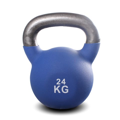 Super lækker 10 kg. kettlebell af støbejern med blå neopren, så den også beskytter gulvet!