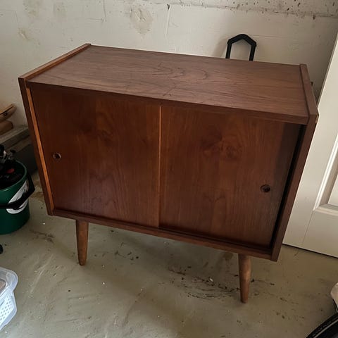 Kommode/skab i teak. Fremstår med brugsspor. Prisen er 900,-