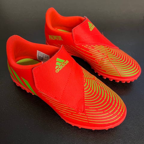 Str. 34, Adidas Predator FREAK .3 fodboldstøvler i rød og grøn farve. Designet til brug på banen med et mønstret ydersål for greb og kontrol. Materialet og størrelsen er ikke angivet.