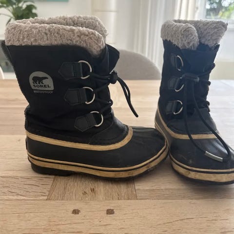 Sorel børn støvler i størrelse 26 til unisex. Støvlerne er designet til børn og har en sort farve med hvid pelskant. Materialet er egnet til at holde fødder varme og beskyttede i koldt vejr.