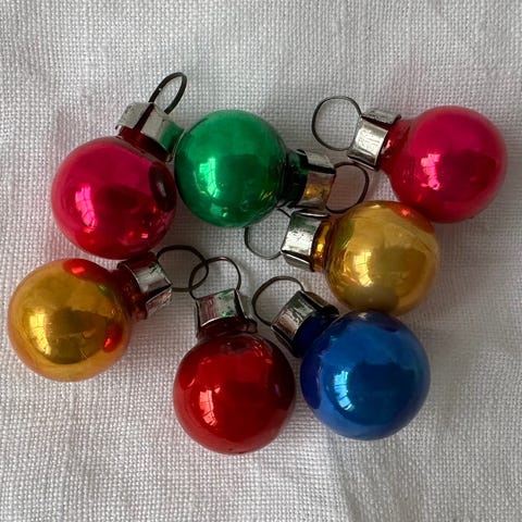Gammelt glas julepynt - miniature julekugler i forskellige julefarver. Perfekte til et minijuletræ.