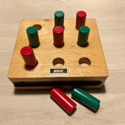 Legetøj, Vintage magnetisk “kryds-og-bolle” spil fra BRIO fra 1970`erne på rød træplade med æske og vejledning
