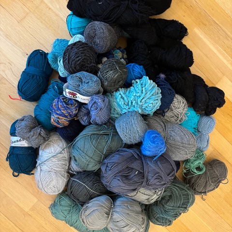 Blandet garnpakke bestående af forskellige farver som gul, grøn, orange, hvid, brun og blå. Pakken indeholder garn i forskellige materialer og tykkelser, velegnet til strikning og hækling.