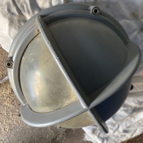 Disse skotlamper skal alle have nye E27 fatninger. Derudover er der faktisk en der er anderledes og ikke rigtigt kan lukkes med nuværende låg. Af de 7 ens har en af dem knækket et skruehul. Derudover ses lidt malingpletter og der mangler nogle maskinskruer til at holde glas og gitter på plads.
