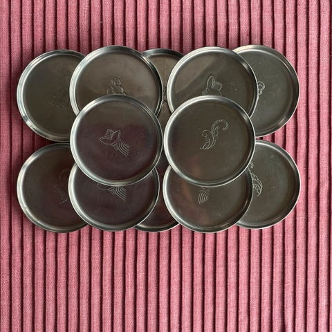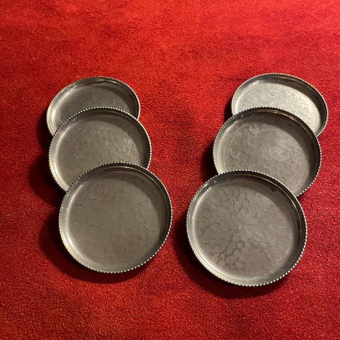 12 stk. glas / flaskebakker fra JYDE KUNST , REAL PEWTER TIN - bakkerne er 8,8 cm. i dia. og i rigtig pæn stand.