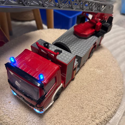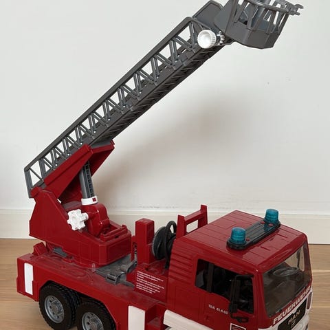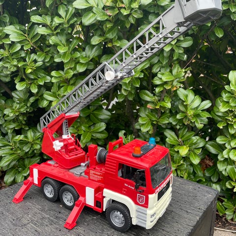 Bruder Scania brandbil legetøj med bevægelig stige. Modellen er detaljeret med rød og hvid farve og blå sirener. Egnet til børn til leg og læring om brandredning.