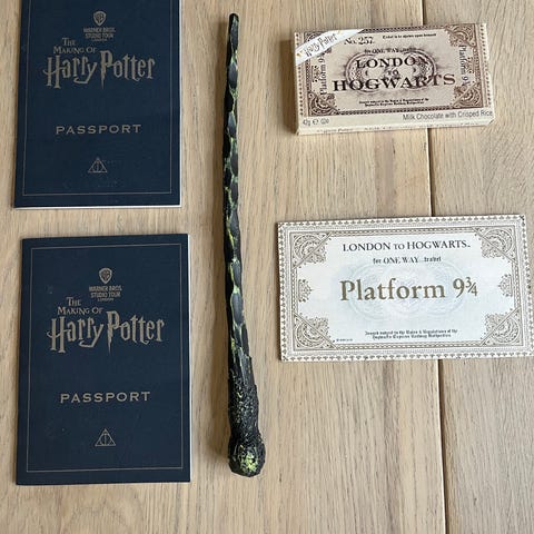 Diverse Harry Potter tryllestav, lampe i rampe, uldtrøje (80%uld), slips, tre tryllestave og en ring