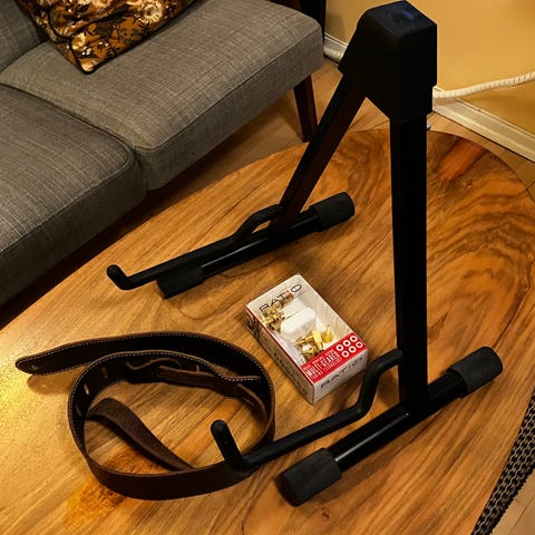 Assorteret guitarudstyr med forskellige pedaler, harmonika, guitarremme, pickups og diverse guitarværktøj. Indeholder elektroniske pedaler, mundharmonika, flere guitarremme i forskellige materialer og farver, samt pickups og små reservedele til guitarer. priser fra 50 kr