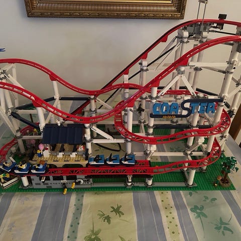 LEGO Creator Rutsjebane legetøj med rød og hvid farve, lavet af plastik. Sættet inkluderer detaljer som spor, figurer og forskellige elementer, der skildrer en rutsjebaneoplevelse.