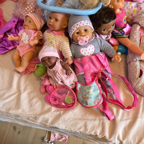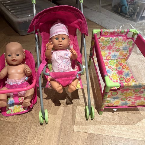 Baby Born dukketilbehør sæt bestående af klapvogn, seng og autostol i lyserøde og blå farver. Passer til Baby Born dukker.