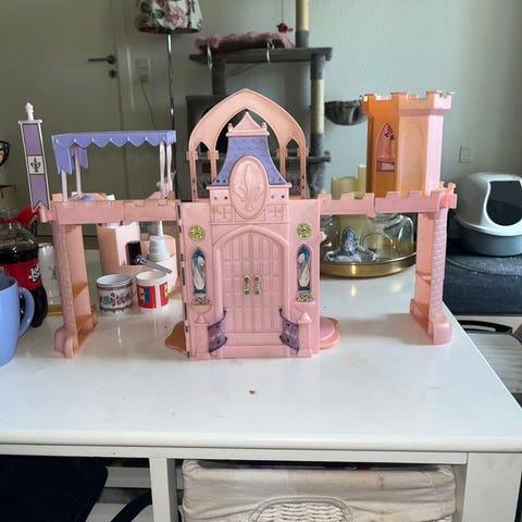 Barbie str 'klapsammen' slot, fra Disney eventyr. Der står B på et skilt på slottet, det kan stå for BELLE eller Beauty & The beast eller Barbie.