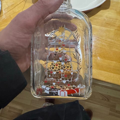 Holmegaard Juledekoration glaskrukke med låg. Krukken er dekoreret med julemotiver som rensdyr, juletræ, hjerter og grene. Materialet er klart glas med trykte dekorationer i farverne rød, brun og hvid. Velegnet til opbevaring eller som dekorativ genstand i julen.