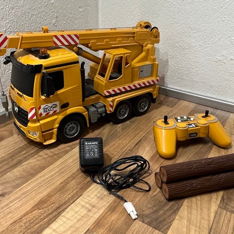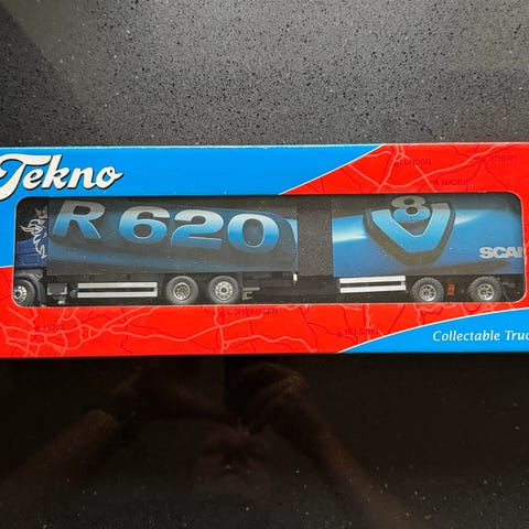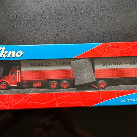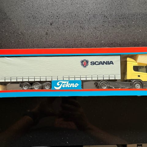 Scania Lastbil med trailer legetøj. Modellen består af en blå lastbil med hvid trailer med Scania logo. Legetøjet er designet til børn og kan bruges til leg og samling.