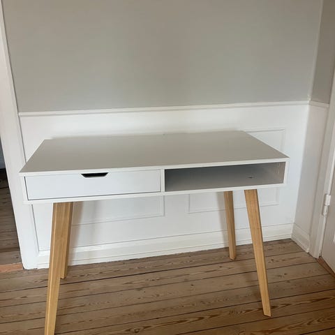 Et stk hvidt skrivebord med træben med tre skuffer.