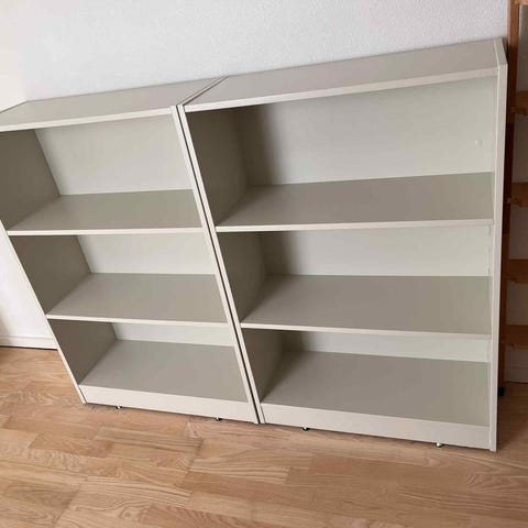 To reoler. Den ene med jalousilåge og den anden med almindelige låger. Reolerne er 80 bredde 88 høje og dybden er 33 (med låger) 43 med jalousilåge. Den store har et lille mærke på 5 mm (se billede) ellers er de i perfekt stand.