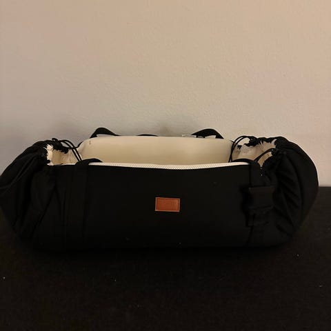 Den er nyvasket i neutral sæbe og klar en til anden lille familie. Der er både bæresele og et lille håndtag, som kan tages af og på.