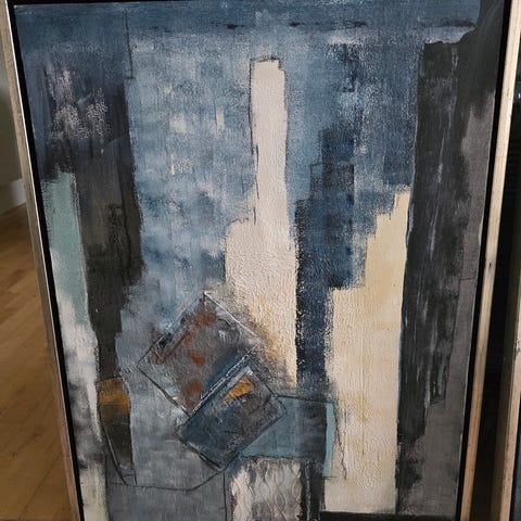 Tre malerier af Jette Krogsgaard sælges samlet. De to med hvide rammer måler 44X34 cm. Maleriet med den sølvfarvede ramme måler 54x54 cm