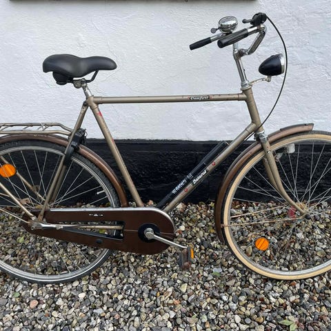 Grøn Batavus Ascot retro herrecykel. Denne klassisk minimalistisk retro-cykel, fremstår med rust og patina, men det ser fint ud. Denne klassisk minimalistisk retrocykel, er super cool. Retrocyklen er størrelse 60 og sadlen kan sættes op eller ned, ny kæde, støtteben, fodbremse til baghjulet, skærme til for og baghjul, lukket kædeskærm, kodelås, stelnummer WHE5346242A. Denne herre cykel er perfekt til dig, som gerne vil skille sig dig i gadebilledet. Dette fine grønne pedaldrevet køretøjer, køre fint, har dog en revne i sadlen. Så er du til grøn energi og bæredygtighed, er dette transportmiddel lige noget for dig. Hvis du også mener, at offentlig transport er for dyr, og hvis du nyder frisk luft på dine kinder og gratis motion, så er denne green bike / bicycle det perfekte valg for dig, og kan blive din for 1.800 kr.