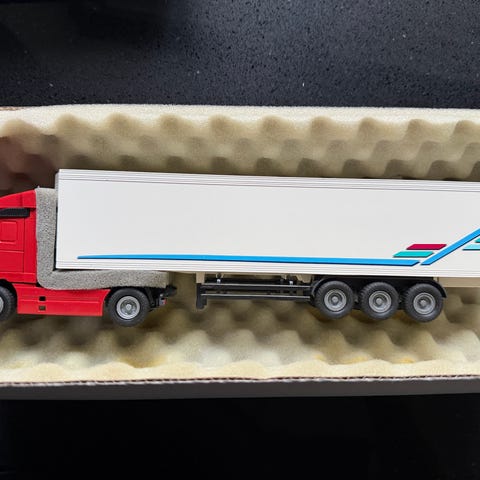 Volvo FH12 6x2 2-axle trailer model, miniature scale, white color with blue and red detailing, suitable for display or collection purposes.