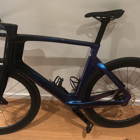Flaskeholdere, garmin mount, pedaler og SRAM AXS-lader medfølger.