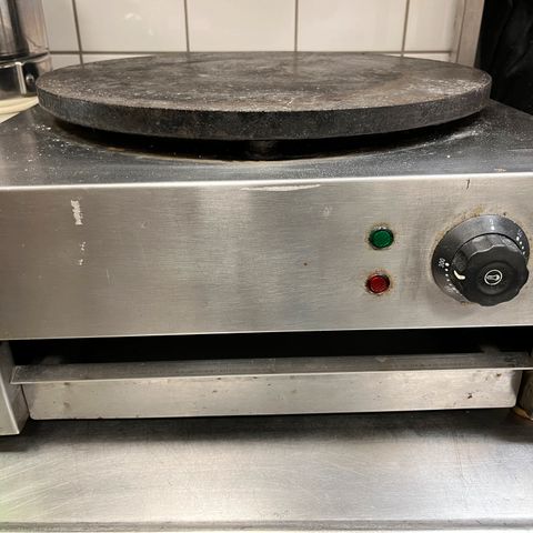 Køkkenchef elektrisk pandekagepande med justerbar temperaturkontrol. Sort farve, rund form, egnet til tilberedning af pandekager og lignende retter. Kun Brugt en gang.