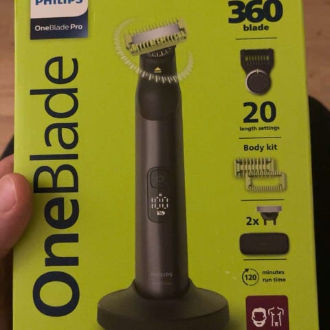 Philips OneBlade Pro trimmer og shaver med 360 Blade teknologi. Inkluderer 20 justerbare længdeindstillinger, kropstrimmer-sæt, og to udskiftelige blade. Leveres med opladningsstand og USB-kabel. Farve: sort.
