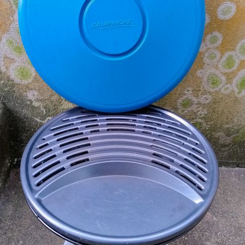 Campingaz Grillo camping grill med rund form og stativ. Grillen har et låg med håndtag, rist til madlavning og en justerbar varmefunktion. Designet til udendørs brug.