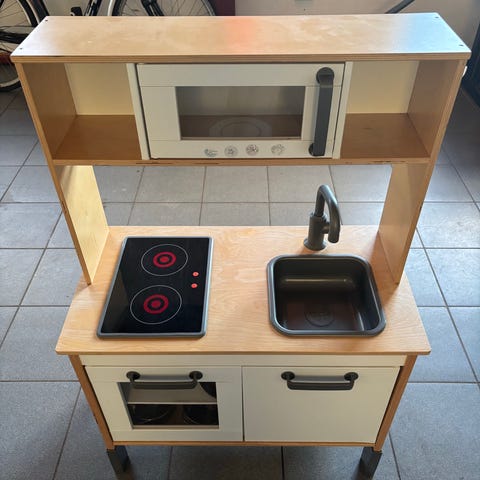 IKEA Duktig legekøkken i rosa. Køkkenet har ovn, vask og kogeplader samt opbevaringsplads bag låger. Batterierne er lige skiftet, og den ene kogeplade kan lyse. Der medfølger en masse tilbehør. Legemad i træ fra Hape, køkkenudstyr og et fint tesæt i metal med Bluey på.
