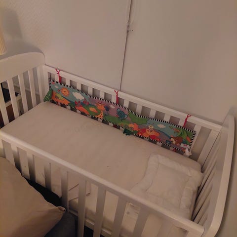 Bedside seng til baby med remme, så sengen kan spændes fast.