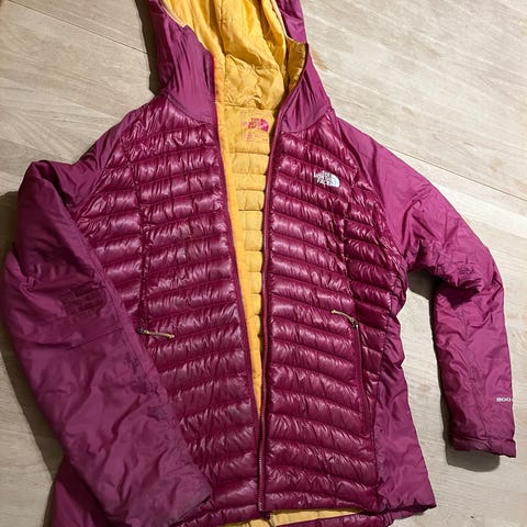 The North Face Herre Dunjakke i størrelse XXL. Jakken er rød med sorte detaljer og er designet til sport og udendørs aktiviteter. Materialet er isolerende dun, som giver varme og komfort.