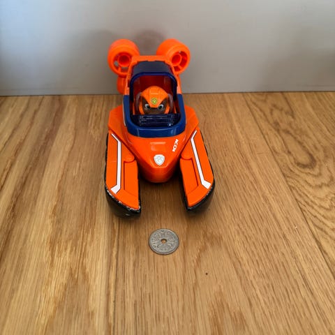 Paw Patrol legetøjsbåd i rød farve med detaljer i blå, hvid og gul. Båden har flere funktioner og er egnet til leg for børn.