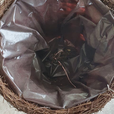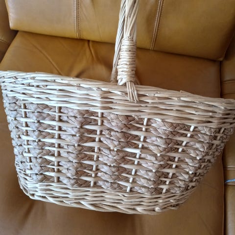 Flettet kurv til blomster/vin/andet.. med hank, sælges for 35 kr.. (foret indvendig med plastik til blomst)... vil være sød med et rødt bånd og en flot blomst i....