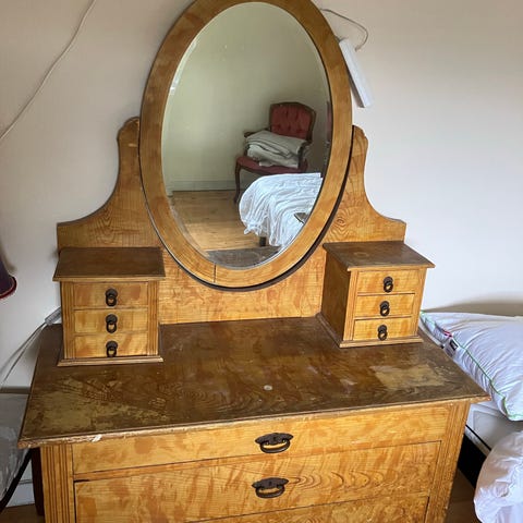 Jeg sælger denne kommode i ægte træ. Den er godt brugt og mangler et håndtag i den midterste skuffe. Det er et pænt mørk møbel, som passer perfekt til en gang. Jeg sælger den for 500 kr.
