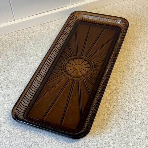 smukt rosafarvet fad i presset glas, formet som et trekløver og med bladmønster i bunden. Kan anvendes til både tapas, slik, snacks, nødder, smykker eller noget helt andet. Måler ca 22 x 22 cm