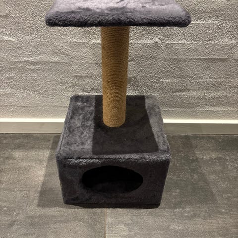 Kradsetræ til kat med hule, to søjler med reb til klatring og en hængekøje øverst. Fremstillet i blødt gråt materiale. Velegnet til katte til leg og hvile.