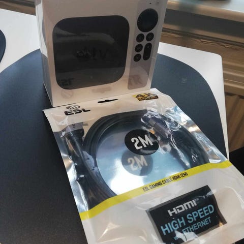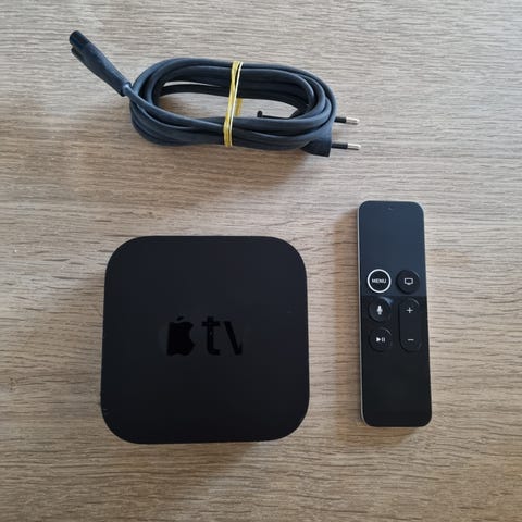 Apple TV 4K med fjernbetjening og HDMI-kabel.