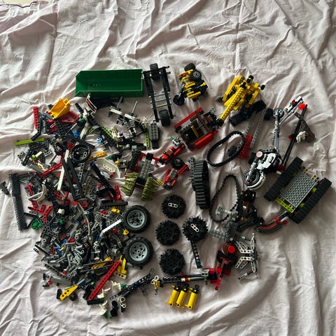 LEGO Technic 812 gear sæt med forskellige tandhjul i blå og gul farve. Sættet indeholder flere geardele og er designet til at bygge mekaniske modeller. Passer til LEGO Technic tema. 7 gule tandhjul 11 blå 13 røde 15 grå klodser plus masse af dimser. Plus bygge anvisning tandhjul æske 812 er komplet. sender gerne. Giv et bud