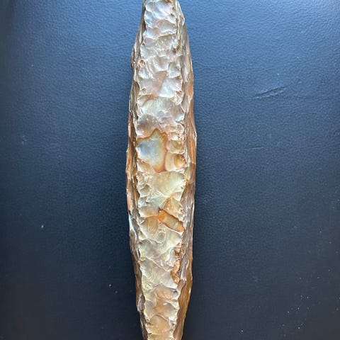 En fin sleben økse fra stenalderen på 14cm som har været brugt til arbejde i sin tid.