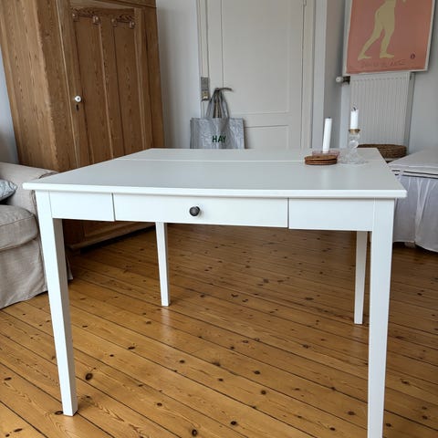 Fint og solidt skrivebord eller spisebord i serien “ÖVRARYD” fra IKEA. Rigtig god stand, et par enkelte ridser må forventes. Stellet er i metal hvid.