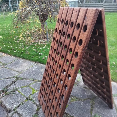 Reolen måler 40 cm i højden, 32 cm i bredden og blot 33 cm i dybden, når den er foldet sammen 10 cm. Dens foldbare konstruktion gør den nem at flytte og placere, uanset om den skal stå i en vinkælder, bag baren eller som dekorativt element i en restaurant