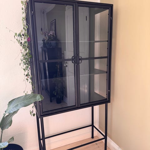 Jeg har et gråt metal vitrineskab i industri stil, fra Ikea Fabrikør 2 glashylder nypris 1200, til salg for 700.