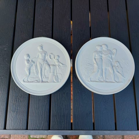 Sæt bestående af tre relieffigurer i hvidt porcelæn med forskellige motiver, herunder figurer af mennesker og dyr. Dekorationerne har en klassisk stil og kan anvendes som vægophæng eller dekorative elementer i hjemmet.