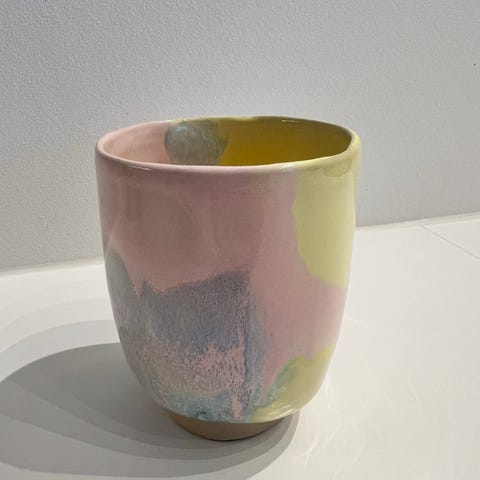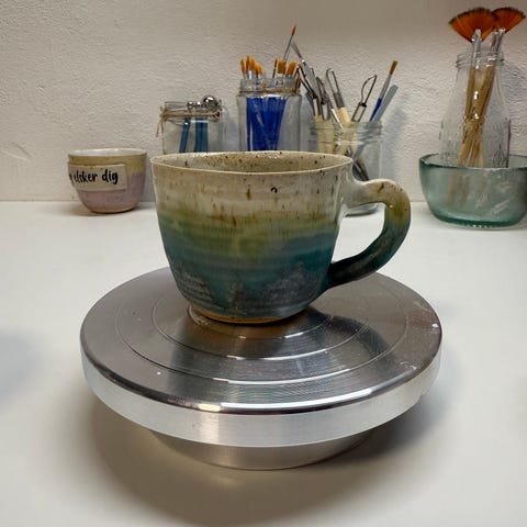 Keramisk kop med teksten 'MOR TID' i grøn og beige farve. Koppen har en rund form og er håndlavet med en glaseret overflade.