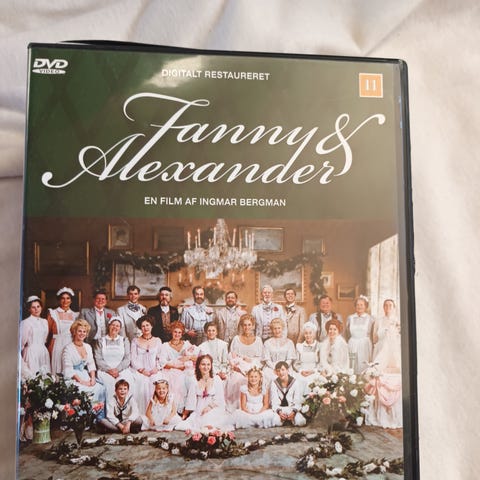 DVD med filmen Fanny & Alexander, instrueret af Ingmar Bergman. Filmen indeholder skuespillere og scener som vist på coveret, med et drama centreret omkring familiedynamikker.