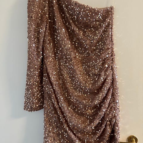 Fin kjole, med sløjfe bagpå, som lukkes ved at binde sløjfen. Har sort inderstof, så kjolen kradser ikke. Perfekt til nytåret.